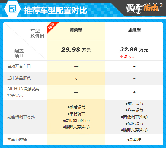通过对比配置不难发现,顶配的旗舰型与入门的推荐车型相比,增加了多项高阶配置,提升了科技感的同时,进一步提升了乘客的乘坐体验。不过,这些配置均属于锦上添花的类型,对于用车体验提升并不明显,并且后排液晶屏推荐车型也可选装,再结合两者3万元的差价,不建议升级。