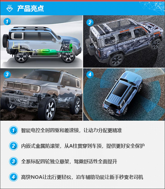 对于一款越野车,安全性是不可动摇的底线。新车搭载内嵌式金属防滚架,从A柱直接贯穿到车顶,形成一体化保护结构。当意外翻滚发生时,车身可以最大程度守护乘员舱的完整。此外,三重外部防护系统,为电池安全树立新标杆。第一重是2mm厚的高强度钢板,抵御直接撞击。第二重是47mm的护板间隙,形成缓冲吸能区。第三重是柔性越野底盘和非承载架构,通过悬架和电池之间的柔性连接卸力。