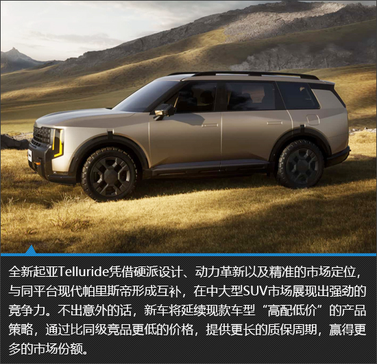 全新起亚Telluride采用更极致的“方盒子”造型以及更丰富的细节设计,强化了豪华感与越野属性,实现了从“简单家用”到“轻奢硬汉”的转型,定位直指北美中高端SUV市场。