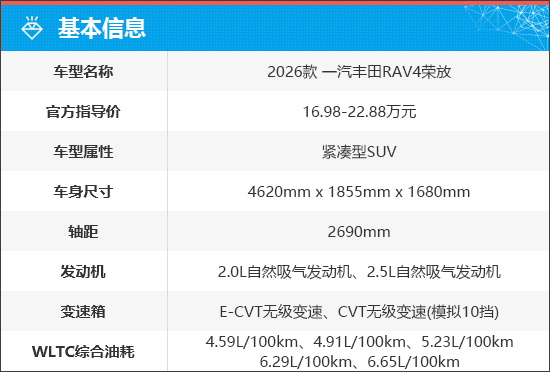 11月21日,第六代一汽丰田RAV4荣放正式上市,共推出6款车型,官方指导价区间为16.98-22.88万元。动力方面,新车提供2.0L汽油版、2.0L混动版以及2.5L混动版可选,WLTC综合油耗最低仅为4.59L/100km。