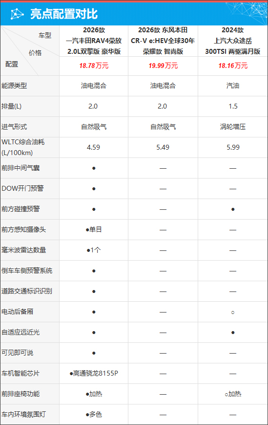指导价方面,上汽大众新途岳无论是起售价还是顶配售价均是三款车型中最低的,消费者购车成本更低;第六代一汽丰田RAV4荣放和东风本田CR-V的指导价区间较为接近,处于同级主流水平。
