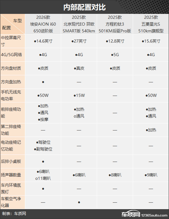 本次推荐的四款车型都是同级综合实力出众的代表性产品,埃安AION i60拥有全面的舒适配置和主动安全能力,且CLTC纯电续航里程最长,适合日常家用和有长途用车需求的用户;北京现代EO 羿欧作为合资产品,针对本土市场深度思考,拥有尺寸更大的中控屏,被动安全配置相对丰富;方程豹钛3外观造型最为个性,其拥有出色的辅助驾驶能力,并且也是唯一采用后轮驱动的车型,对年轻消费者来说更具吸引力;五菱星光S的内部纵向空间更宽裕,独享前排侧窗多层隔音玻璃,适合经常有多人用车需求且注重配置均衡性的群体。总体来说,四款车型各具特色,考虑购买纯电紧凑型SUV的消费者可根据自身需求进行选择。