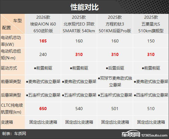 本次参与对比的四款车均采用纯电动力驱动,分别为埃安AION i60、北京现代EO 羿欧、方程豹钛3、五菱星光S。除北京现代EO 羿欧为合资品牌产品外,另外三款车均来自自主品牌。售价方面,官方指导价均在14万元以下。