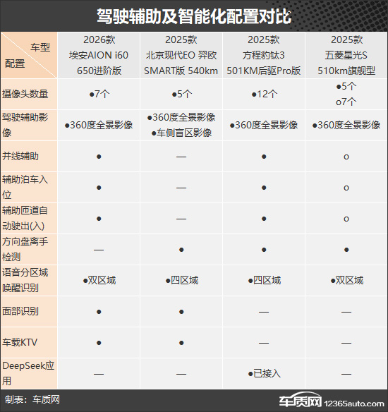 四款车型的驾驶辅助等级均达到L2级,驾驶辅助硬件方面,方程豹钛3的摄像头数量最突出,为12个。驾驶辅助功能上,埃安AION i60和方程豹钛3的功能种类多样,值得肯定。
