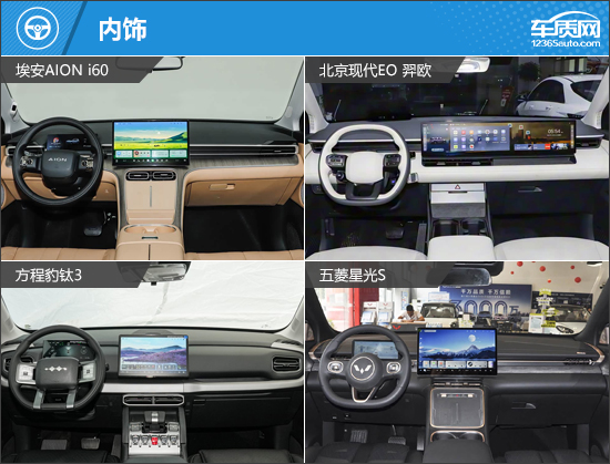 外观方面,埃安AION i60采用众多平直的线条勾勒,车身整体呈现出方正的造型,贯穿风格头灯不仅充满科技感,而且增加了车头横向视觉宽度。北京现代EO 羿欧正好相反,其将车身弯角处刻画出更多弧度,配合平缓的整车线条,营造出圆润饱满的视觉效果。方程豹钛3在四款车中是最独特的存在,棱角分明的线条和宽体造型,彰显出别具一格的肌肉感,宛如一台电影中的机甲风格战车。五菱星光S采用狭长的头灯和封闭式前脸的设计,配合下方的梯形网状通风口,将运动感和时尚感演绎得淋漓尽致。