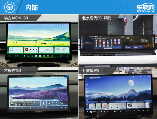 内饰部分,均采用T字形布局。方程豹钛3整体设计相对较为硬核,保留了类似飞机座舱操作台一样的中控按键,其余三款车均为简约舒适的风格,以大尺寸屏幕替代了物理按键。其中,北京现代EO 羿欧的仪表屏设置在靠近前风挡的位置,驾驶员观察车辆信息时更便捷。同时,北京现代EO 羿欧的超大尺寸中控屏一直延伸到副驾,能更好地兼顾副驾乘客的娱乐需求。