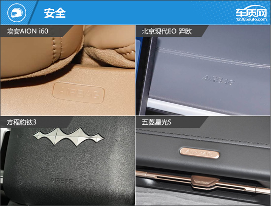 安全配置方面,四款车均具备基础的主/被动安全功能。被动安全上,北京现代EO 羿欧独享后排侧气囊,表现出众;埃安AION i60和五菱星光S并未配备前排中间气囊,令人有些失望。主动安全上,埃安AION i60和方程豹钛3的配置都很丰富。相比之下,北京现代EO 羿欧和五菱星光S则有明显缺失,但后者提供了部分配置的选装机会。