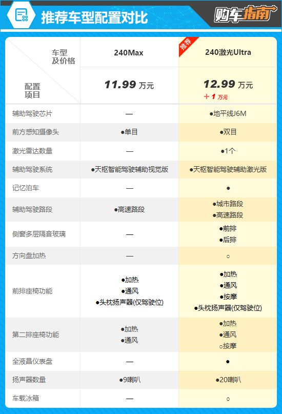 在2个动力版本中,我们推荐的均是顶配车型。首先来看增程版,推荐车型相比低一级车型,采用了地平线J6M辅助驾驶芯片,总算力达到128TOPS,前方感知摄像头也提升至双目,并增加了1个激光雷达,使其拥有记忆泊车、城市路段辅助驾驶等功能,这在同价位车型中较为少见。此外,推荐车型还增加了前/后排侧窗多层隔音玻璃、全液晶仪表盘、前排座椅按摩等功能,进一步提升日常用车体验。并且还支持选装舒享包,包含方向盘加热、车载冰箱等。价格仅比低一级车型多10000元,性价比出色。