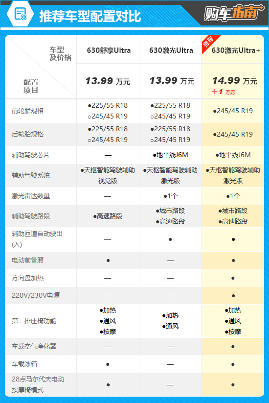 指导价为14.99万元的630激光Ultra+是纯电版的推荐车型。相比低一级车型,推荐车型标配了19英寸逐光运动轮毂套装,令侧面更加动感。并且还增加了电动前备厢、方向盘加热、第二排座椅按摩功能、车载冰箱等,均是非常实用的配置,价格仅比低一级车型多10000元,绝对物超所值。