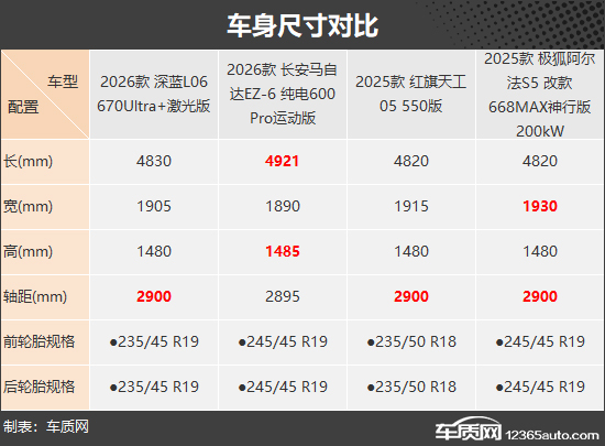 在车身尺寸方面,四款车型的轴距差异不大,整体都能提供宽敞的乘坐空间,仅长安马自达EZ-6以5mm的差距略微落后。不过,其车长和车高占据优势,理论上在装载能力上更具潜力。极狐阿尔法S5则在车宽上领先,横向乘坐空间更为从容。