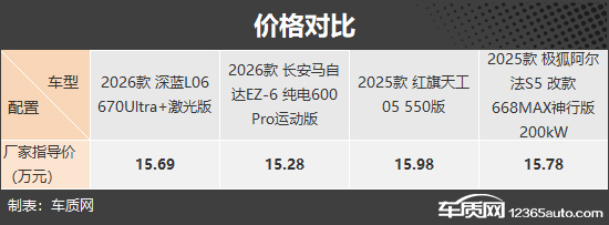 本次推荐的四款车型售价相近,深蓝L06作为全新推出的产品,市场关注度极高;长安马自达EZ-6是唯一的合资品牌车型,且刚刚完成了小改款;红旗天工05和极狐阿尔法S5同样为相对成熟的产品,市场表现较为稳定(由于目前图片数量较少,因此部分车型的图片并不是相对应的具体款型)。