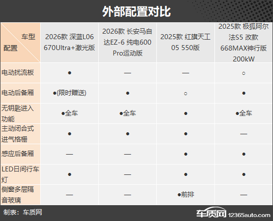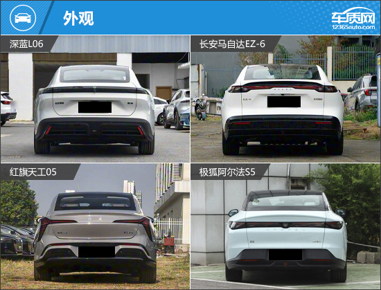 在外部配置方面,长安马自达EZ-6的表现相对逊色,缺失配置较多。深蓝L06是四款车中唯一配备电动扰流板的车型;红旗天工05通过前排侧窗多层隔音玻璃在座舱静谧性上达到更高水准;同时,其与极狐阿尔法S5均提供了感应后备厢,日常使用的便利性也很出色。