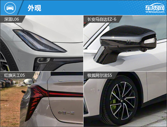 四款车型均迎合当下的年轻化审美,整体气质动感、鲜明,但在细节演绎上又展现出不同的个性。深蓝L06采用分体式花瓣灯组,前脸呈现俯冲姿态,简洁之中带着力量;长安马自达EZ-6延续魂动语言,光之翼前脸灯组以流动光效展现出富有节奏感的视觉氛围;红旗天工05走潮派路线,是四款车中唯一没有使用贯穿式尾灯的车型,Y字形元素让尾部更具辨识度;极狐阿尔法S5的风塑造型以自然曲面为主,线条的层次处理使优雅与运动感达到平衡。
