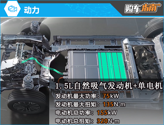 动力方面,新车搭载由1.5L自然吸气发动机与前置单电机组成的插电混动系统,发动机最大功率75kW,最大扭矩135N·m;电动机总功率155kW,总扭矩320N·m。根据配置的不同,车辆的CLTC综合工况纯电续航里程分别为170km和180km。
