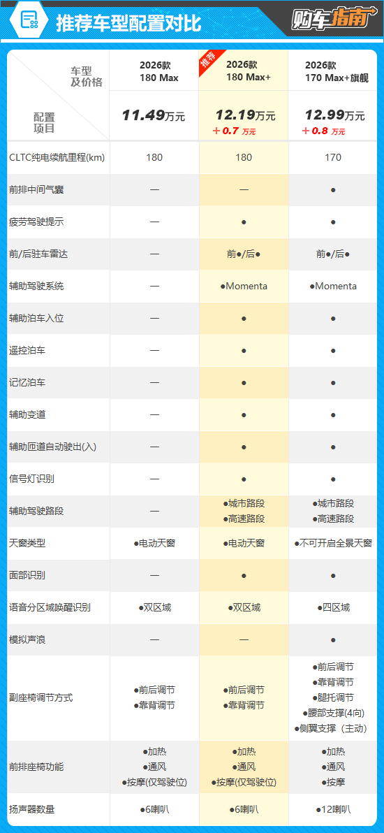 目前在售的5款车型中,更推荐180 Max+。推荐车型相比低一级别车型,在驾驶硬件、驾驶功能方面有明显提升,如增加前/后驻车雷达、辅助泊车入位、Momenta辅助驾驶系统等,而价格却仅仅高出0.7万元,可谓是物超所值。