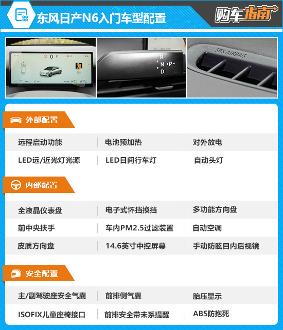 2026款东风日产N6的入门车型为180 Air,从配置水平来看,这款入门车型整体表现一般,虽然可以提供LED远/近光灯光源、前排侧气囊、自动空调等配置,但在驾驶功能、驾驶硬件、车外灯光、安全和舒适性配置方面表现一般,因此不做推荐。