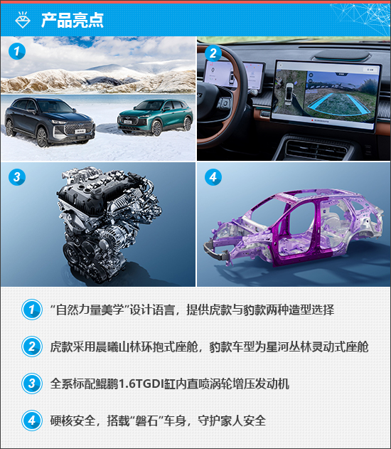 内饰部分,虎款和豹款的设计亦有所区别。其中,虎款车型采用10.25英寸仪表屏以及15.6英寸中控屏的组合,空调出风口下方配有两个手机放置平台;豹款车型配备13.2英寸一体式竖置屏幕,更具视觉冲击力。高通骁龙8155芯片为全系标配,车机内置最新版本的雄狮系统,功能性以及智能化表现均可圈可点。
