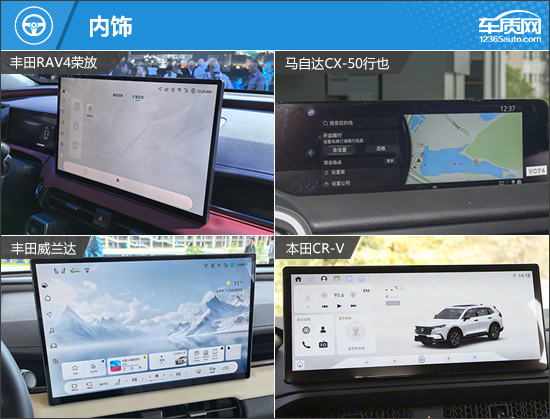 内饰方面,四款车型都采用传统式设计。丰田RAV4荣放和丰田威兰达根据国内消费者的需求特点进行了调整,布局更为简洁。马自达CX-50行也延续了海外版车型的设计,非常注重机械感的营造,这是很多目标客户喜欢的设计。小尺寸中控屏虽然缺乏科技感,但好处是可以减少对视线造成遮挡。本田CR-V采用品牌最新的家族化风格,蜂窝状贯穿式空调出风口、悬浮式中控屏和多功能三辐式方向盘,也同样出现在其他本田品牌车型上。