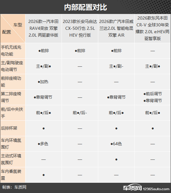 内部配置方面,丰田RAV4荣放表现可圈可点,不仅独享前排座椅加热和车内香氛装置,还配备了多色车内环境氛围灯和主/副驾驶座电动调节。相比之下,马自达CX-50行也的表现要逊色不少,缺失多项配置,会影响到驾乘者的用车体验。