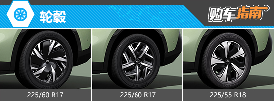 405Air车型搭载光影风刃17英寸轮毂,405Max和506Pro车型则配备棱界交错17英寸轮毂,造型均比较时尚,具体规格为225/60 R17;其余车型均搭载星芒幻宇18英寸轮毂,具体规格为225/55 R18。