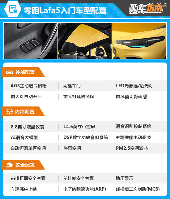 2026款零跑Lafa5入门车型的价格虽然很有诱惑力,但配置表现一般,并且是全系车型中唯一配备低功率动力系统的车型,驾驶体验与其他车型有明显区别,所以此次并不推荐。