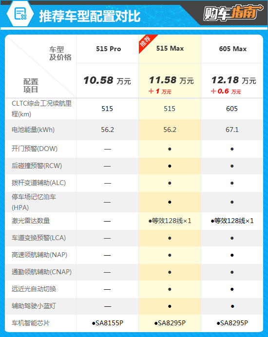 通过对比配置不难发现,推荐车型相较于515 Pro,新增了多项实用的辅助驾驶功能与安全配置,更将车机芯片升级为SA8295P,智能化体验得到显著提升。考虑到两者差价仅1万元,能换来使用感受上的大幅升级,性价比十分突出,值得推荐。