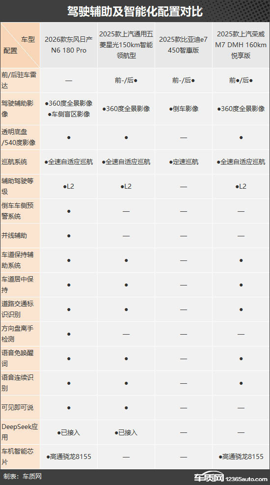 智能化配置方面,东风日产N6和五菱星光整体表现更好,配置更为齐全,前者还配备了高通骁龙8155车机智能芯片。此外,这两款车型都已接入DeepSeek应用,智能交互表现更好。比亚迪e7在这一环节表现拉胯,配置层面缺失较多。