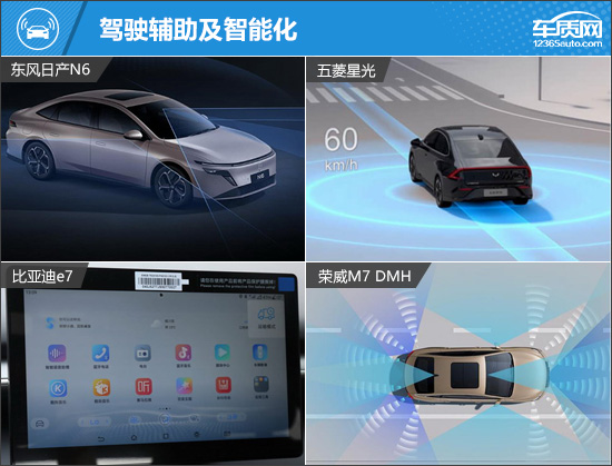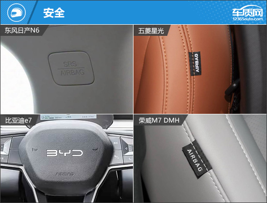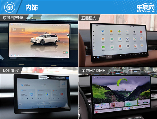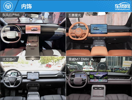 外部配置方面,东风日产N6、五菱星光和荣威M7 DMH的表现可圈可点。其中,五菱星光独享转向辅助灯、雨量感应式雨刷和前后排侧窗多层隔音玻璃,可以带来更好的用车体验;东风日产N6和荣威M7 DMH的优势体现在配备了自适应远近光和天窗。相比之下,比亚迪e7要明显逊色于其他三款车型,缺失多项配置。