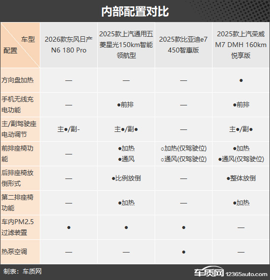 内部配置方面,五菱星光和荣威M7 DMH整体表现更好,前者的优势在于独享副驾驶座椅通风,可以带来更好的乘坐体验;后者则是配备了方向盘加热,这一配置对驾驶者非常友好。相比之下,比亚迪e7、东风日产N6整体表现一般,与另外两款车型有一定差距。