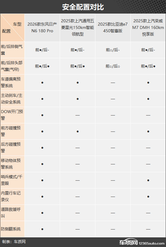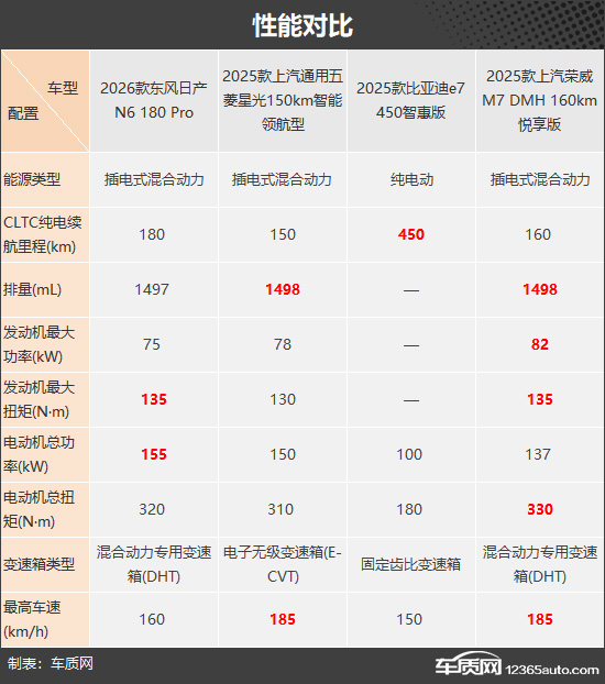 本次挑选的四款车型分别为2026款东风日产N6 180 Pro(以下称:东风日产N6)、2025款上汽通用五菱星光150km智能领航型(以下称:五菱星光)、2025款比亚迪e7 450智惠版(以下称:比亚迪e7)和2025款上汽荣威M7 DMH 160km悦享版(以下称:荣威M7 DMH)。四款车型的市场定位比较接近,虽然厂家指导价略有差距,但实际购买价格较为接近,均在10万元左右(由于目前图片数量较少,因此部分车型的图片并不是相对应的具体款型)。