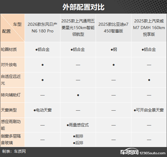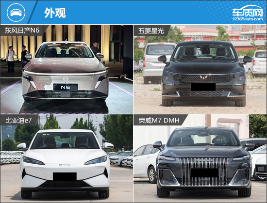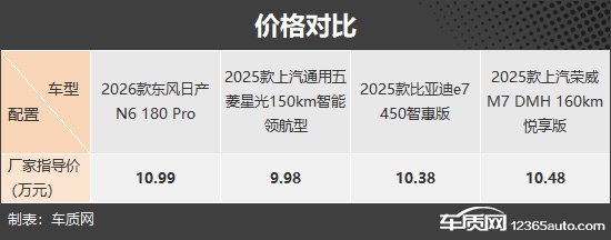 本次挑选的四款车型分别为2026款东风日产N6 180 Pro(以下称:东风日产N6)、2025款上汽通用五菱星光150km智能领航型(以下称:五菱星光)、2025款比亚迪e7 450智惠版(以下称:比亚迪e7)和2025款上汽荣威M7 DMH 160km悦享版(以下称:荣威M7 DMH)。四款车型的市场定位比较接近,虽然厂家指导价略有差距,但实际购买价格较为接近,均在10万元左右(由于目前图片数量较少,因此部分车型的图片并不是相对应的具体款型)。