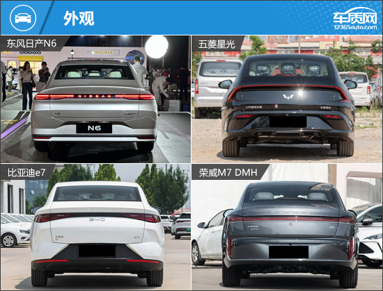 车尾设计方面,五菱星光和荣威M7 DMH配备当下流行的贯穿式尾灯组;东风日产N6则是选择了狭长式尾灯组,并通过装饰条实现贯通式的效果;比亚迪e7采用双轮弦月环抱式尾灯,整体造型更圆润,与前灯组形成前后呼应。