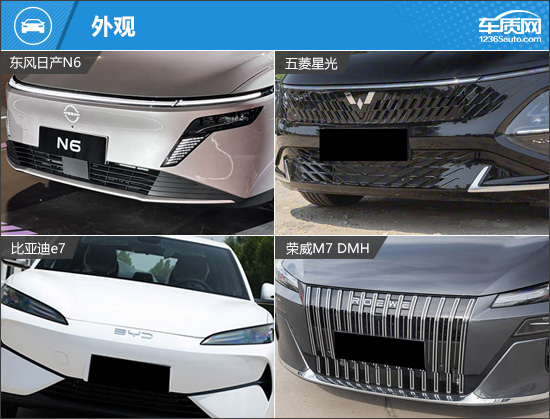 外观方面,四款车型均采用简洁的设计风格,在大气中又不失运动,非常符合国内消费者的审美。前脸设计方面,东风日产N6和比亚迪e7为新能源车型常见的封闭式设计,五菱星光和荣威M7 DMH的整体视觉效果略显传统。此外,东风日产N6和五菱星光的前脸还加入了贯通式元素,以起到拉伸视觉宽度的作用。荣威M7 DMH则是通过直瀑式元素增强车头的厚重感。