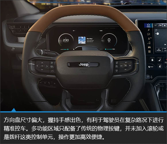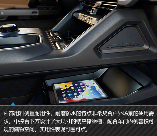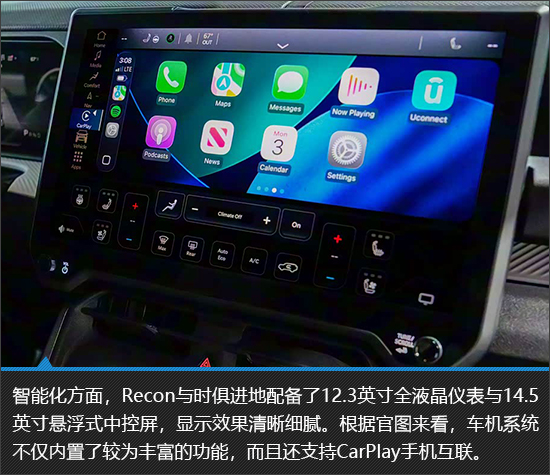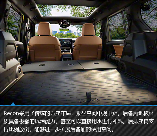 Jeep Recon的内饰秉持着实用主义,以规整布局搭配双屏交互系统,兼顾了操作便利性与科技感。耐磨防水的材质非常符合其硬派越野车的定位,虽然乘坐空间中规中矩,并无亮眼之处,但是车内强大的储物能力确实很有吸引力。无论是应对日常家用场景还是装载大量的户外装备,都能够游刃有余。