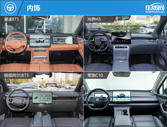 四款车在内饰部分均沿用了新能源车型常见的简洁思路,“T”形仪表台布局规整,电子式怀挡换挡上手轻松,但整体新意略显不足。细节方面,尚界H5是四款车中唯一采用三辐方向盘的车型;星途ET5则独享副驾娱乐屏,可提升乘员的娱乐体验;极狐阿尔法T5未配备传统仪表盘,部分用户或需时间适应这一设定;而零跑C10依旧延续了中规中矩的表现。
