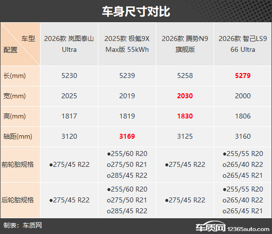 车身尺寸方面,腾势N9在车宽与车高维度占据优势,智己LS9则以车身长度领先;轴距表现上,极氪9X凭借3169mm的出色表现一骑绝尘。轮毂方面,岚图泰山与腾势N9均标配22英寸轮毂,气场直接拉满;极氪9X和智己LS9标配20英寸轮毂,同时提供21英寸、22英寸轮毂选装方案,可满足不同用户的个性化需求。