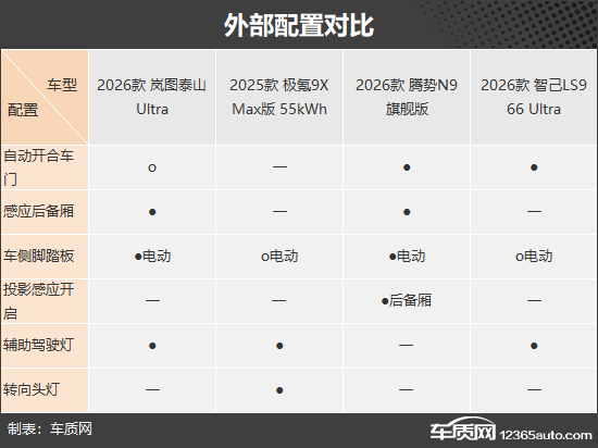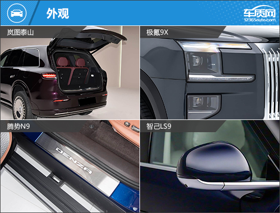 外部配置方面,四款车型的基础配置都比较完善,差异主要体现在细节功能上。其中,腾势N9和岚图泰山表现相对突出,二者均标配了感应后备厢与电动车侧脚踏板,日常使用的便利性拉满。而腾势N9更配备了后备厢投影感应开启功能,科技感更强;此外,极氪9X是四款车中唯一配备转向头灯的车型,夜间行车的照明体验会更贴心;稍有遗憾的是,腾势N9是唯一未配备辅助驾驶灯的车型。