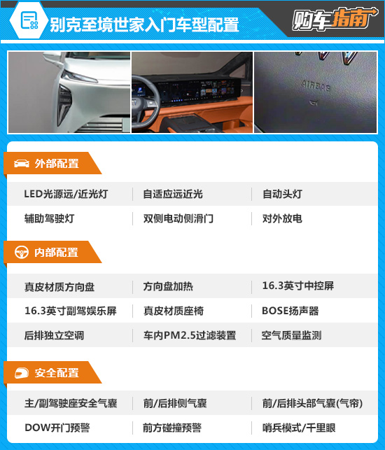 指导价为43.99万元尊享版是入门版车型,虽说是最低配,但毕竟售价也超过了43万元,像是双侧电动侧滑门、方向盘加热、后排独立空调等实用功能均有配备,科技感十足的16.3英寸副驾娱乐屏也有搭载。并且还配备了丰富的主/被动安全配置,已经足够满足日常使用。不过,别克至境世家的一些亮点配置在入门版车型上并未搭载,因此不作为重点推荐。
