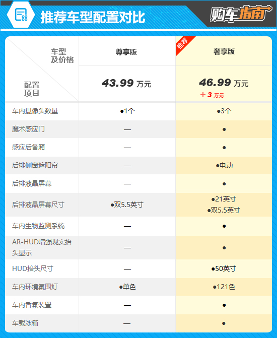 指导价为46.99万元的奢享版是本次的推荐车型。通过配置对比可以看出,推荐车型相比尊享版,增加了魔术感应门以及感应后备厢,进一步提升日常用车的便利性。此外,当下流行的后排液晶屏幕和车载冰箱也没有缺席,满足用户多元化用车需求。并且推荐车型还增加了车内生物监测系统,当车辆熄火锁车后,系统会在一定时间内持续监测车内是否有生命体,避免被“遗忘”的儿童、宠物因遗留车内而带来的危险发生。从售价来看,虽然相比尊享版多3万元,但绝对物有所值。
