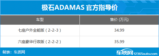 12月28日,极石ADAMA正式上市,新车定位中大型SUV,采用1.5T增程动力,配置上将提供电吸门、车载冰箱、零重力座椅以及后排娱乐屏等。此次上市新车共推出2款车型,售价区间为34.99-35.99万元,上市权益价33.49-34.49万元。
