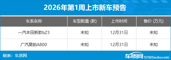 2026年第1周(12月29日-2026年1月4日)上市新车预告