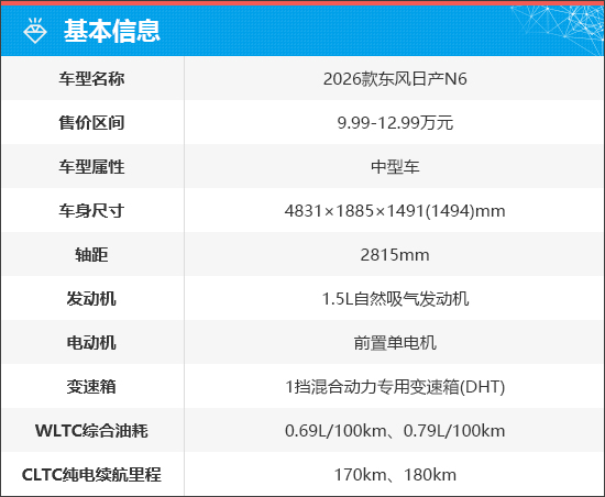 东风日产N6共提供5款车型,官方指导价9.99-12.99万元。除了极具竞争力的价格,购车还可以享受无套路自燃包赔、跨年购置税补贴等重磅福利。新车搭载超舒适底盘、趋近于无感的平顺插混动力、可全场景舒适刹停的全域智能防晕车2.0技术,以及对标百万级豪车的图书馆级静谧座舱,将舒适驾乘体验直接拉满。