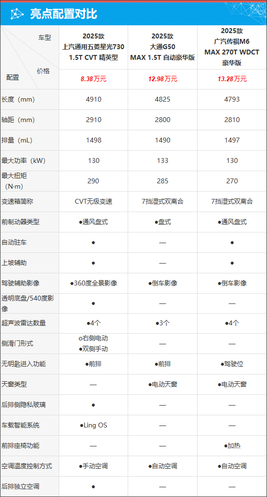 根据售价区间来看,2025款五菱星光730确实非常亲民,对比另外两款车型具备相当大的竞争优势。车型数量方面,2025款五菱星光730和2025款大通G50均提供2款配置可选,不过后者包含了一款网约定制版;2025款广汽传祺M6仅有1款配置车型。