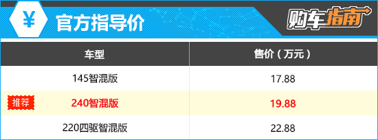 轮毂方面,145智混版采用18英寸多辐轮毂,与之匹配的轮胎规格为235/60 R18;240智混版和220四驱智混版均配备20英寸多辐双色轮毂,前者颇为时尚,后者更加大气,与之匹配的轮胎规格均为255/45 R20。
