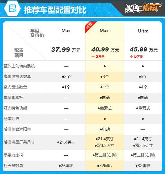 从全系配置来看,个人倾向推荐Max+。推荐车型相比入门款,核心增配整体主动转向系统,可大幅降低日常转弯、掉头的操控难度,让驾驶更灵活轻便。同时,推荐车型还新增电动车侧脚踏板、像素式灯光特色功能、场景灯语、电动后排侧窗遮阳帘、后排双3.5英寸液晶屏幕以及第二排(右侧)零重力座椅等舒适性与科技性配置,用车体验实现显著进阶。结合3万元的差价来看,性价比优势突出。