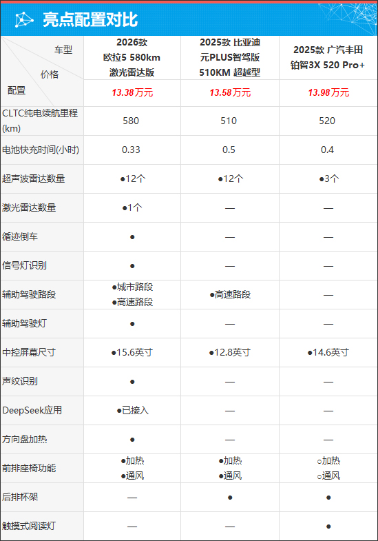 具体到车辆配置层面,我们挑选了售价尽可能相近的车型。通过表格对比来看,欧拉5的CLTC纯电续航里程达到580km,是3款车型中最长的,并且电池快充时间也最短,仅为0.33小时。此外,欧拉5独占1个激光雷达,使其拥有城市/高速路段的辅助驾驶能力,并且还配备了辅助驾驶灯,这在同级中较为少见。舒适性配置欧拉5也占有一定的优势,不仅配备前排座椅加热/通风功能,还独占方向盘加热,拥有更好的用车体验。