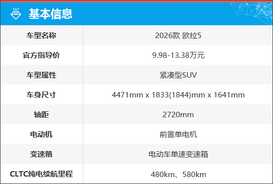 欧拉5共推出5款车型,官方指导价区间为9.98-13.38万元,限时换新价为9.18万元起。同时,官方还推出升级礼、质保礼、充电无忧礼等9重上市礼遇(详情请咨询当地经销商)。