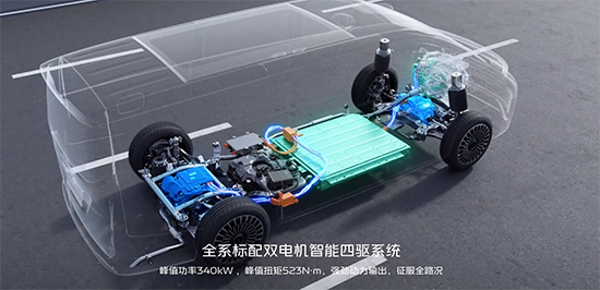 动力系统方面,吉利银河V900将搭载1.5T发动机+双电机组成的增程动力系统,综合功率340kW,综合扭矩523N·m,CLTC纯电续航里程根据车型不同分为220km和260km两种,满油满电综合续航分别为1180km和1220km。