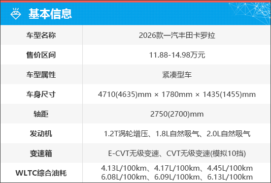 2026款一汽丰田卡罗拉共推出6款车型,售价区间11.88-14.98万元,新车提供三种动力可选,外观采用丰田品牌全新设计语言。