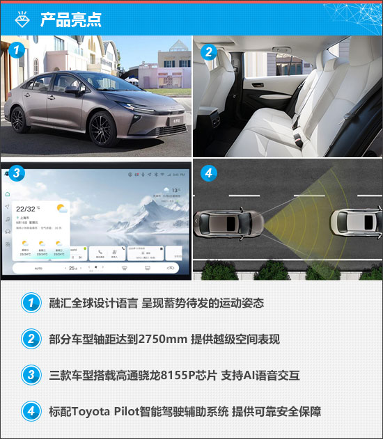 智能驾驶辅助方面,新车全系搭载Toyota Pilot智能驾驶辅助系统,标配DRCC动态雷达巡航控制系统、LTA智能车道循迹系统、LDA车道偏离警示系统以及AHB自动远光灯调节系统;在此基础上,部分车型还额外配备PDA预判式主动驾驶辅助系统、RSA道路标识识别辅助系统、EDSS紧急驾驶停止系统,全方位构建起可靠的行车安全防护体系。
